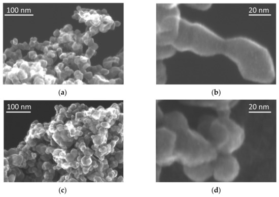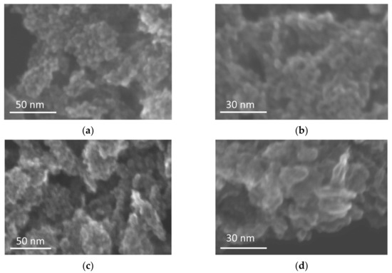 Next, it was investigated if such huge differences in defect densities between pristine and modified samples could also cause changes in the sample morphology. Accordingly, STEM images were captured for four different samples, and the obtained data are shown in Figure 5 and Figure 6. Although the differences between associated white and black samples are not huge, it could be observed that the surface (especially in the case of the P25-based samples) was slightly destroyed, as clearly seen by the comparison between images (b) and (d).