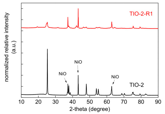 XRD patterns for TIO-2-based samples: pristine and modified (TIO-2-R1) titania mixed with internal standard (NiO): original data were normalized to the standard.