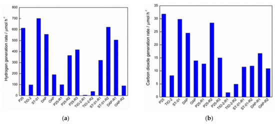 The photocatalytic activity of the obtained samples was tested for degradation of organic compounds, hydrogen evolution and bacteria inactivation under irradiation with UV or vis, as well as in the dark. First, methanol dehydrogenation (H2 evolution) under UV irradiation was tested, and the obtained results are shown in Figure 8. Since pristine titania is practically inactive in this reaction (high overvoltage of hydrogen evolution), a metallic (usually platinum) co-catalyst is commonly used. Indeed, high photocatalytic activity has been obtained for platinum-modified samples (in-situ platinum photodeposition), reaching 0.7 mM/h of hydrogen evolution for the ST01 commercial titania. The activity of the pristine samples decreases in the following order: ST01 > P25 > DAP > OAP > TIO-2, which correlates well with the specific surface area of these samples (Table 2). Obviously, the larger the specific surface area is, the larger is the number of active sites for hydrogen formation. The lower-than-expected activity for the OAP sample (considering its large specific surface area and perfectly shaped morphology) could result from the low content of surface defects (electron traps; ETs). It should be pointed out that platinum photodeposition is very fast under anaerobic conditions and in the presence of methanol as a hole scavenger, which usually results in the completion of the reaction within a few minutes [65]. At the same, this also means that formed deposits of platinum might easily aggregate, especially in the case of titania samples with a low content of ETs (active sites for metal cations’ adsorption [66] and reduction). Accordingly, to form uniformly distributed deposits of noble metals on the surface of titania, photodeposition in the initial presence of oxygen/air in the system has even been proposed [65].