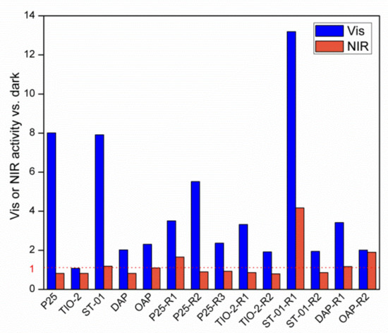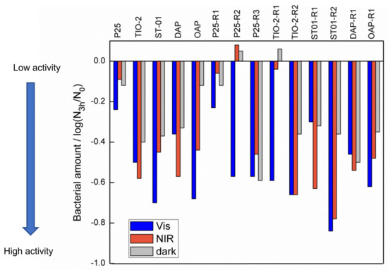 Next, the bactericidal activity of all samples was examined under vis, NIR and in the dark, and the obtained data are shown in Figure 10. It has been found that titania photocatalysts exhibit a broad spectrum of antibacterial properties, depending on the light conditions. The activities of most samples under vis were higher than those under NIR. The highest enhancement of activity under vis in comparison to pristine samples of three orders of magnitude is achieved for P25-R2 and P25-R3, with the TIO-2-R2, TIO-2-R1, ST01-R2 and DAP-R1 samples showing a ca. one order of magnitude increase. In contrast, there is no activity enhancement for P25-R1 and even a decrease for ST01-R1 and OAP-R1. Although ST01-R2 exhibits high vis activity, ST01-R1 does not, despite its high phenol-oxidation activity. In the case of NIR, a significant activity increase is achieved for both ST01-modified samples. Interestingly, NIR causes an increase in bacterial colonies for the P25-R1 sample. It is well known that in the case of the oxidative decomposition of organic compounds (e.g., phenol), different ROS (superoxide anion radicals and hydroxyl radicals) might be responsible for the reaction mechanism. However, for the inactivation of Gram-negative bacteria, the attack by hydroxyl radical is more important since the superoxide anion radical might be repelled by the anionic bacterial cell wall membrane [52]. Therefore, it is possible that the photocatalytic process under NIR conditions causes some changes in the electrical charge distribution on the bacterial cell wall, which might be crucial for the integrity of the bacterial membrane, or electrolysis of molecules on the bacterial cell surface. Accordingly, this homeostatic imbalance might lead to bacterial death [76]. Therefore, it is proposed that the mechanisms of oxidative decomposition of phenol and microorganisms must be different, and this needs further investigation.