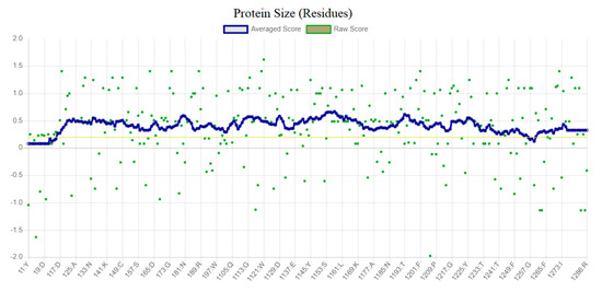 The Ramachandran graph was used to validate the homology modeling (Figure 1). This diagram represents all possible combinations of dihedral angles (Ψ versus φ) in the amino acids of a polypeptide chain [38]. This technique exposes the combinations of the excellent stability of these angles, making it possible to validate the probable structure of the biomolecule [39]. According to the diagram, 91.5% of the residues of the modeled protein are in favorable regions (red region), 6.5% of the residues are in the additionally allowed region (Regions a, b, l, p, yellow), 1.6% are located in the generously allowed regions (Regions ~a, ~b, ~l, ~p, i.e., light yellow), and 0.4% are in unfavorable regions (black region). It is worth noting that the residues found in unfavorable regions refer to the structures used as a template. In addition, some residues are located at the ends of the protein [39]. The VERIFY 3D (Figure 2) was used to stipulate the compatibility of an atomic model (3D) with an amino acid sequence (1D) for the modeled protein. The % of residues with a mean 3D-1D score ≥ 0.2 are acceptable [25]. In the present study, about 93.71% of the residues had a mean 3D-1D score ≥ 0.2. These results show that the proposed model was compatible with its frequency. Thus, the Ramachandran diagram made it possible to identify the regions that maintained the conserved structure and the variable locations with alignment since 91.5% of the modeled protein residues are in favorable regions. Furthermore, VERIFY 3D proved the compatibility of the atomic model (3D) with the amino acid sequence (1D) since the model developed had an average score 3D-1D ≥ 0.2 of 93.71%. Therefore, the data from the Ramachandran chart and Verify 3D validate the model obtained in this work.