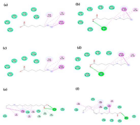 Diagrammatic representation of the interactions between the ligands and the enzyme’s active site. (a) Octanoic acid; (b) Decanoic acid; (c) Dodecanoic acid; (d) Tetradecanoic acid; (e) Hexadecanoic acid; (f) cis-9-octadecanoic acid.