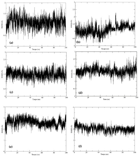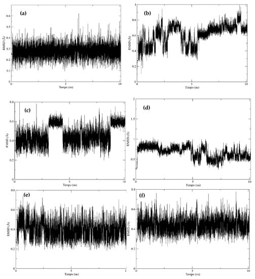 For the construction of the study solutions, in addition to the molecular dynamics scripts, the CHARMM-GUI website https://www.charmm-gui.org/ (accessed on 25 August 2022) was used [64,65]. The PDB file of the complex formed by the enzyme and the ligand was chosen in its best docking pose, and a rectangular water box set at an edge distance of 10 Å from the protein was added [66]. A cubic system with an edge equal to 75 Å and crystalline angles of 90° (alpha, beta, and gamma) was then created. The periodic boundary conditions PME and FFT were generated automatically [67,68]. The force field adopted was the Charmm36m. All molecular dynamics simulations used the following fixed conditions: temperature of 313.15 K, pressure of 1 atm, and pH 7.0, and the TIP3P water model [69]. For each simulation, energy minimization was performed with ten thousand steps in ensemble NVT. Then, equilibrium simulations were performed at 10 ns in NpT ensemble. Finally, a production simulation starting at 10 ns, being extended until a situation of equilibrium of the complex was observed in the RMSD graph but never exceeding the time of 100 ns. All simulations had an integration step of 1 fs [69,70]. The graphics were visualized using Visual Molecular Dynamics (VMD) software (University of Illinois, Urbana-Champaign, IL, USA) [71].