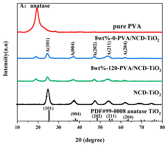 The X-ray diffraction technique was performed to identify the crystal structure and phase composition of PVA, 8 wt%-0-PVA/TiO2, 8 wt%-120-PVA/TiO2, and NCD-TiO2. According to JCPDS card no. 99-0008, all synthesized NCD-TiO2 photocatalysts displayed the characteristic peaks of anatase TiO2. In Figure 2, the peak identified at 2θ ≈ 20° should be assigned to the response of PVA [21]. The XRD patterns of 8 wt%-120-PVA/TiO2 are very similar to those of 8 wt%-0-PVA/TiO2, both of which have diffraction peaks at 19.55° (i.e., PVA) and 25.35° (anatase TiO2 (101)) [34]. Moreover, the crystal form of NCD-TiO2 remained unchanged during preparation. The Raman spectra (see Figure S2 in Supplementary Materials) also support the conclusions.