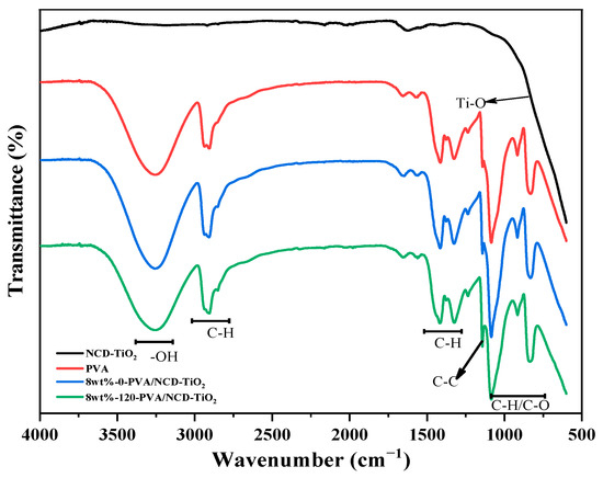 The results show that the PVA crystallinity decreased from 0.1216 (PVA) to 0.1185 (8 wt%-0-PVA/NCD-TiO2) after modification, indicating that the introduction of NCD-TiO2 changed the physical properties of PVA, i.e., there was improvement in the ductility and a decrease in the permeability [40,41].