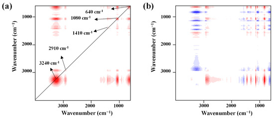 2DCOS analysis diagram of PVA/NCD-TiO2. (a) Synchronous spectral analysis and (b) asynchronous spectral analysis.
