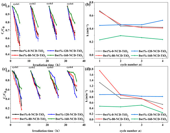 (a) Degradation of phenol and (b) the reaction rate constant k for the photocatalytic degradation of phenol during four cycles in the presence of the PVA/NCD-TiO2 hybrid films treated at different temperatures; (c) degradation of LEV and (d) the reaction rate constant k for the photocatalytic degradation of LEV during four cycles in the presence of the PVA/NCD-TiO2 hybrid films treated at different temperatures.