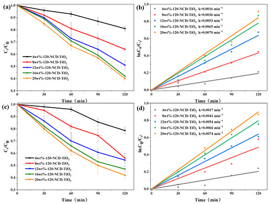 The contaminant removal rate with nanohybrid films with various concentrations of NCD-TiO2 nanoparticle was investigated, as shown in Figure 6. All PVA/NCD-TiO2 films were thermally treated at 120 °C to ensure the stability of the catalytic films. It can be observed that the photocatalytic activities of the films were significantly improved, as the weight ratio of NCD-TiO2 to PVA increased from 4 wt% to 20 wt%. The enhancement in photocatalytic activity can be attributed to a higher amount of active NCD-TiO2 and the hydrophilicity behavior of the NCD-TiO2 nanoparticle [45], which can increase the wettability of the membrane surface. The difference between the sample 4 wt%-120-NCD-TiO2 and 8 wt%-120NCD-TiO2 is very apparent (2.25 times in k for phenol and 2.41 times for LEV). The rising trend of photocatalytic activity decreased with an increase in NCD-TiO2 content, which may be attributed to the fact that the increasing concentration of NCD-TiO2 nanoparticles led to decreased surface activity and inhibited the contact of pollutants with nanoparticles. A too-high concentration of NCD-TiO2 has been reported to result in more severe aggregation, which greatly reduces the surface area and is unfavorable for pollutant photocatalytic degradation [46].
