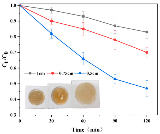 The effect of thickness of PVA/NCD-TiO2 films on its photocatalytic activity was also examined. The films with different thickness were prepared by static casting the same PVA/NCD-TiO2 solution with different molds (the inset of Figure 7). The effect of 3 thicknesses (i.e., 1 cm, 0.75 cm, 0.5 cm) on the catalytic activity was checked, as displayed in Figure 7. The experimental results show that the PVA/NCD-TiO2 film with the thickness of 0.5 cm had the best photocatalytic activity, suggesting a thicker film would not benefit the catalytic efficiency. The thinner but larger film would result in better dispersion of NCD-TiO2 and a larger active area for visible-light photocatalytic illumination, which can eventually improve the photocatalytic efficiency. Hence, the film should be as thin as possible (e.g., 0.5 cm) when the strength of the film is guaranteed.