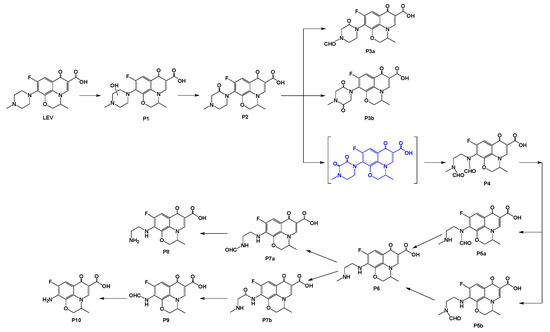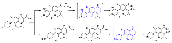 Mass spectrometric analysis of the intermediates of LEV during photocatalytic degradation was performed in this work. Seventeen byproducts were deduced by referring to previous research [47,48,49,50,51], and the reaction mechanism derived (i.e., mainly photogenerated holes and partially superoxide radical) was in line with our previous work [34]. The detailed information of the deduced byproducts is listed in Table 2. In the comparison of the structures of the byproducts with those of LEV, the piperazinyl group of LEV appears transformed in all byproducts. Among the 17 byproducts, only 2 byproducts (P11 and P14) have changes in both the quinolone ring and the piperazinyl group, while the remaining 15 byproducts only have the change in the piperazinyl group.