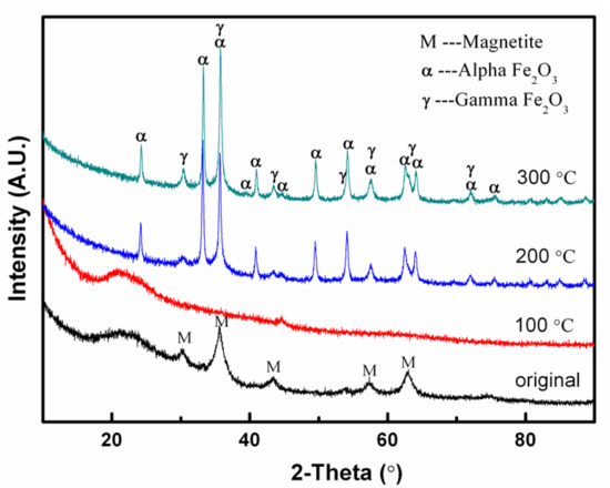 XRD analyzed the prepared samples after calcination at 100 °C, 200 °C, and 300 °C. The results are exposed in Figure 1. The original sample is composed of only one phase, the magnetite Fe3O4. In this sample, only 21 wt% are in the crystalline phase, while the other 79 wt% are amorphous. The crystallite size was measured at 4 nm. The 100 °C sample appears almost completely amorphous since no diffraction peaks were detected. Thus, 100 °C appears as a high enough calcination temperature to completely destabilize the magnetite phase. Increasing the calcination temperature leads to higher crystallinity in the material. More precisely, both alpha-Fe2O3 and gamma-Fe2O3 are present after thermal treatment at 200 °C and 300 °C. For the 200 °C samples, the amount of alpha-Fe2O3, gamma-Fe2O3, and amorphous is 35 wt%, 21 wt%, and 44 wt%, respectively. In this sample, the crystal size of the alpha-Fe2O3 phase was about 26 nm, and 6 nm for gamma-Fe2O3. A higher crystallinity is obtained after calcination at 300 °C with an amount of alpha-Fe2O3, gamma-Fe2O3, and amorphous of 45 wt%, 27 wt%, and 28 wt%, respectively. Here, the crystal size of the alpha-Fe2O3 phase was about 26 nm, and 9 nm was for gamma-Fe2O3. Thus, a slightly larger crystallite size of gamma-Fe2O3 was measured after treatment at 300 °C.