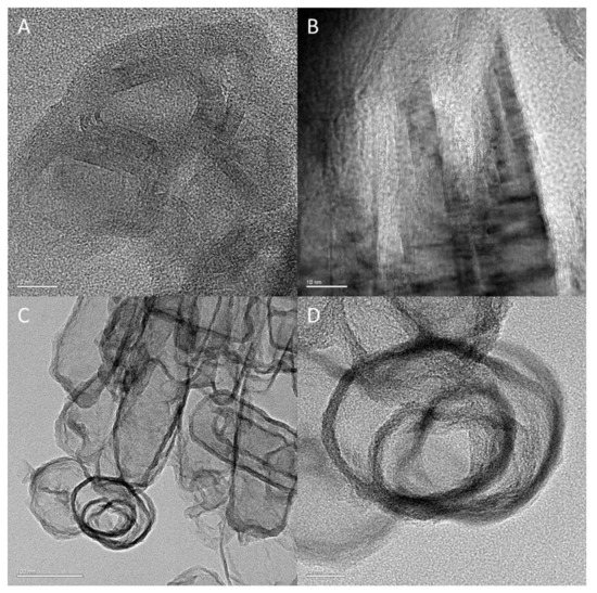 Micrographs of these three materials obtained by transmission electron microscopy are compiled in Figure 2. Figure 2A,B represents the structure of the samples calcined at 100 °C and 200 °C, respectively. With these two images, onion-like lamellar structures clearly appear. However, low-defined structures are obtained due to low crystallinity. As previously seen by XRD, increasing the calcination temperature leads to higher material crystallinity. Figure 2C,D brings to light the well-defined onion-like structure of the sample calcined at 300 °C. On these micrographs, circular lamellar iron structures are observed. In accordance with XRD, the 300 °C sample seems to be more precisely defined with higher phase homogeneity. Without the use of silk cocoon as a sacrificial structural agent, synthesized iron oxide nanoparticles would not show any particular structural shape (e.g., classical spherical nanoparticle morphology). The use of silk cocoons allows the preparation of iron oxide nanomaterials with more defined porosity and morphology with respect to classical methods.