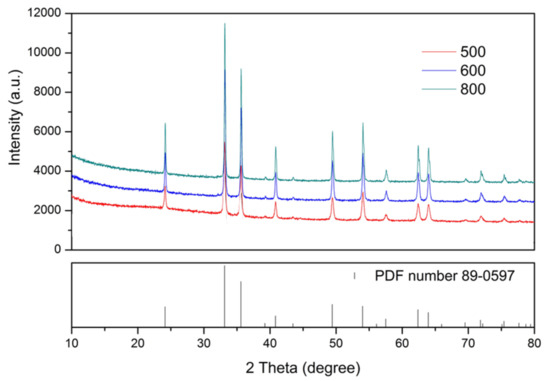 The calcination temperature’s impact on the material structure and reactivity showed thermal treatments at higher temperatures ranging from 500 °C to 800 °C. X-ray diffractograms as well as the reference of hematite alpha-Fe2O3 (PDF number 89-0597), are compiled in Figure 3. According to this XRD analysis, only hematite alpha-Fe2O3 is present in the samples calcined at 500, 600, and 800 °C. These diffractograms measured the crystallite size of 31 nm, 41.6 nm, and 54.9 nm for samples treated at 500, 600, and 800 °C, respectively. Increasing the calcination temperature up to 600 °C or 800 °C leads to larger crystallite sizes. These larger crystallites logically developed a smaller specific surface area. Using the QXRD technique, the ratio between the crystalline phase and the amorphous part of the materials was determined. The amount of amorphous phase decreased at increasing calcination temperatures due to the thermal stability of the alpha-Fe2O3 phase (hematite) with respect to amorphous iron oxide. From 18.31 wt% for the material calcined at 500 °C, the amorphous phase decreased as low as 13.83 wt% after calcination at 800 °C. Intermediate calcination at 600 °C leads to a quantity of amorphous phase of 17.64 wt%. Thus, an important part of each material was successfully synthesized as crystalline phases.