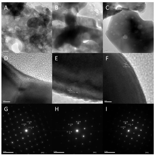 Transmission electron microscopy of samples calcined at (A): 500 °C, (B): 600 °C, and (C): 800 °C. High-resolution transmission electron microscopy of samples calcined at (D): 500 °C, (E): 600 °C, and (F): 800 °C. Selected area electron diffraction during high-resolution microscopy of samples calcined at (G): 500 °C, (H): 600 °C, and (I): 800 °C.