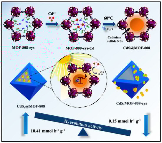 - Ghosh, A.; Karmakar, S.; Rahimi, A.; Roy, R.; Nath, S.; Gautam, U.; Maji, T. Confinement Matters: Stabilization of CdS Nanoparticles inside a Postmodified MOF toward Photocatalytic Hydrogen Evolution. ACS Appl. Mater. Interfaces 2022, 14, 25220–25231. [Google Scholar] [CrossRef] [PubMed]