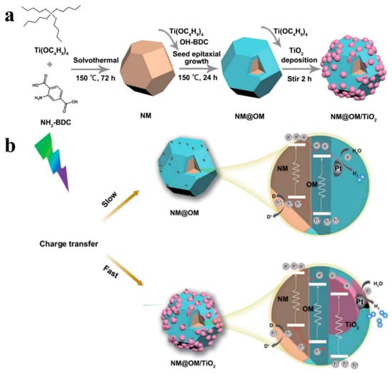 - Chen, Y.; Yang, D.; Xin, X.; Yang, Z.; Gao, Y.; Shi, Y.; Zhao, Z.; An, K.; Wang, W.; Tan, J.; et al. Multi-stepwise charge transfer via MOF@MOF/TiO2 dual-heterojunction photocatalysts towards hydrogen evolution. J. Mater. Chem. A 2022, 10, 9717. [Google Scholar] [CrossRef]