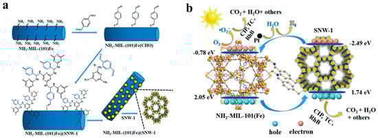 - Wang, Y.; Yang, H.; Shang, Q.; Cheng, Q.; Zhou, H.; Pan, Z. Integrating hollow spherical covalent organic frameworks on NH2-MIL-101(Fe) as high performance heterogeneous photocatalysts. Environ. Sci. Nano 2022, 9, 3081–3093. [Google Scholar] [CrossRef]