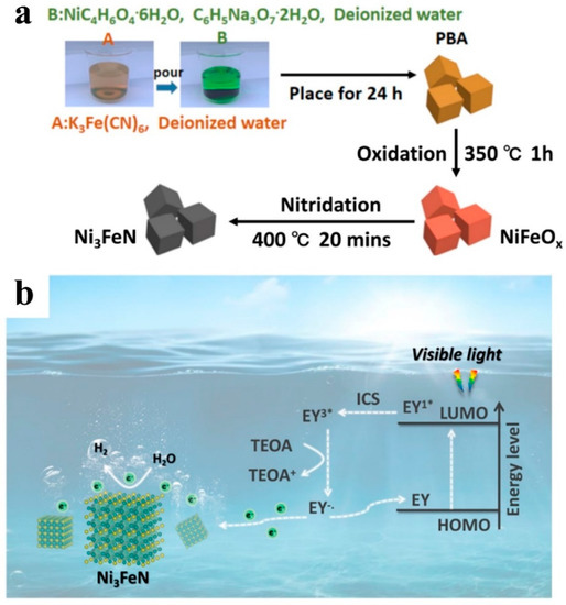 - Qi, W.; Wang, C.; Yu, J.; Adimi, S.; Thomas, T.; Guo, H.; Liu, S.; Yang, M. MOF-Derived Porous Ternary Nickel Iron Nitride Nanocube as a Functional Catalyst toward Water Splitting Hydrogen Evolution for Solar to Chemical Energy Conversion. ACS Appl. Energy Mater. 2022, 5, 6155–6162. [Google Scholar] [CrossRef]