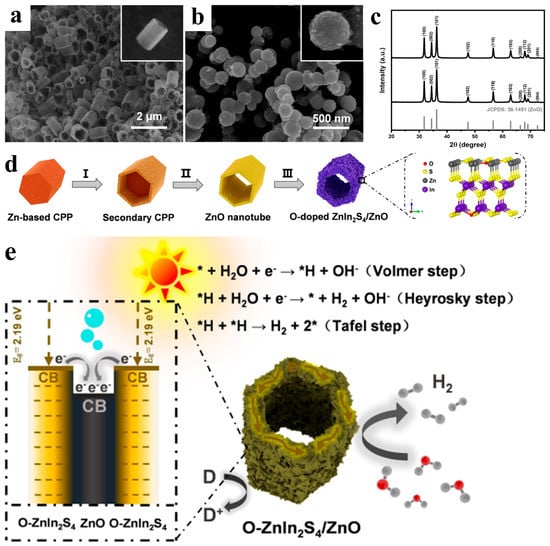 - Zhu, Q.; Xu, S.; Wu, W.; Qi, Y.; Lin, Z.; Li, Y.; Qin, Y. Hierarchical Hollow Zinc Oxide Nanocomposites Derived from Morphology-Tunable Coordination Polymers for Enhanced Solar Hydrogen Production. Angew. Chem. Int. Ed. 2022, 61, e202205312. [Google Scholar] [CrossRef]