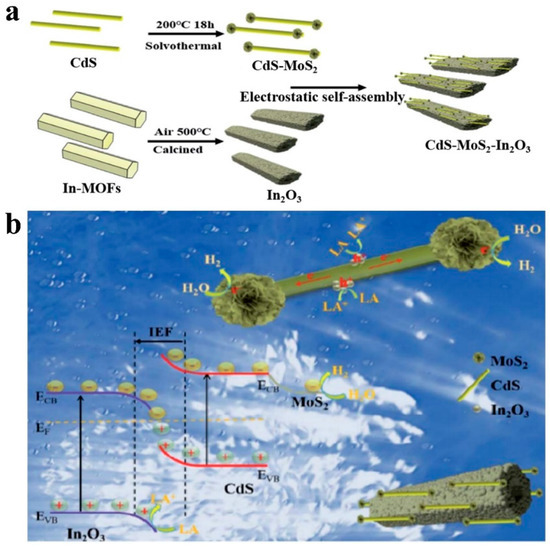 - Zhang, L.; Jiang, X.; Jin, Z.; Tsubaki, N. Spatially separated catalytic sites supplied with the CdS-MoS2-In2O3 ternary dumbbell S-scheme heterojunction for enhanced photocatalytic hydrogen production. J. Mater. Chem. A 2022, 10, 10715. [Google Scholar] [CrossRef]