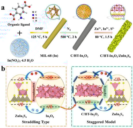 - Bariki, R.; Das, K.; Pradhan, S.; Prusti, B.; Mishra, B. MOF-Derived Hollow Tubular In2O3/MIIIn2S4 (MII: Ca, Mn, and Zn) Heterostructures: Synergetic Charge-Transfer Mechanism and Excellent Photocatalytic Performance to Boost Activation of Small Atmospheric Molecules. ACS Appl. Energy Mater. 2022, 5, 11002–11017. [Google Scholar] [CrossRef]