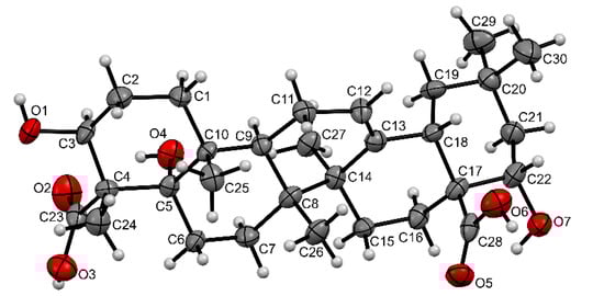 Crystal data of 3β,5α,22α-trihydroxyolean-12-ene-23,28-dioic acid: C30H46O7, M = 51,868, monoclinic, space group P21, at 296 K: a = 14.588(5), b = 7.0874(19), c = 31.788(16) Å, β = 102.25(4)°, V = 519.03(4) Å3, Z = 4, dcalc = 1.179 g·cm−3, µ = 0.083 mm−1, a total of 15,008 (θmax = 27,61°), 2411 unique (Rint = 0.0409), 2248 [I > 2σ(I)], 127 parameters. GooF = 1.015, R1 = 0.0332, wR2 = 0.0870 [I > 2σ(I)], R1 = 0.0365, wR2 = 0.0906 (all data), max/min diff. peak 0.18/−0.12 e·Å−3.