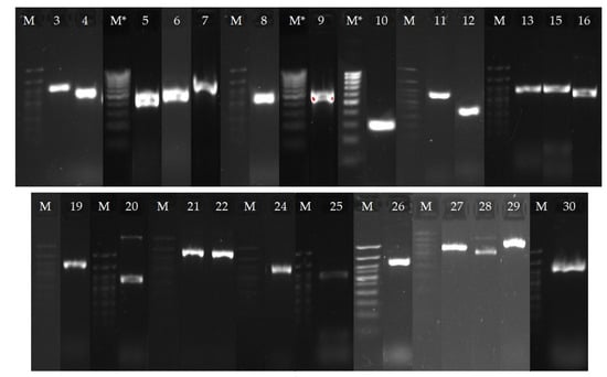 NGS and annotation of the resulting sequences in the NCBI database made it possible to carry out a bioinformatics search for genes presumably involved in the process of OA bioconversion. It is known that the processes of actinomycelial transformation of terpenes involve enzymes of the CYP450 family, which catalyze various oxidation reactions [26]. We detected 30 genes encoding CYP450 in the genome of R. rhodochrous IEGM 757 (Table 5). Using specific primers (Table S1), real-time PCR and subsequent gel electrophoresis allowed the detection of 24 of the putative genes in the genome (Figure 10). The data obtained provided the prerequisites for further study of rhodococci transcriptomes in order to determine the functional genes of OA conversion.
