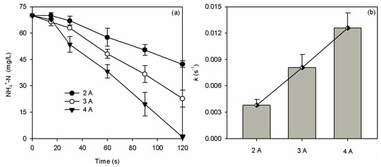 Based on the applied current and treatment time, the total number of electrons from the electrode could be calculated, as shown in Equation (6). Thereby, the total number of electrons transferred to the surface of the graphene anode is 480 C (4.97 mmol) at 4 A and 120 s treatment. Then, according to the electron equilibrium, 3 mol electrons would be transferred when 1 mol NH4+-N is oxidized to N2. As a result, at the reaction conditions (4 A and 120 s treatment), only 23.2 mg of the NH4+-N would be oxidized as a consequence of the reactions on the anode (including direct and indirect electrolysis). Nevertheless, at the conditions (4 A and 120 s treatment), the electrochemical process removed ~69 mg of the NH4+-N (Figure 1a), which was nearly 3 times higher than that of the three-electron transformation (23.2 mg). Therefore, one-electron transformation played a significant role for the NH4+-N degradation in this electrochemical process, such as Equation (7) [16,34]. Because the electrons increased linearly with increasing currents, the k values for the NH4+-N degradation would have an obviously linear correlation with varying currents, as shown in Figure 1b.