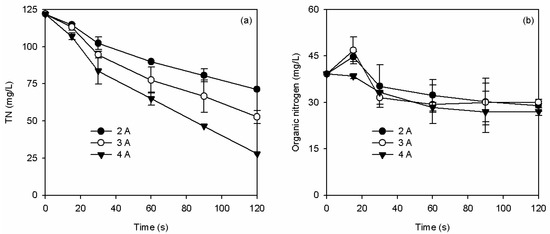 In addition, the concentration of organic nitrogen can be calculated according to the analysis for NH4+-N, TN, NO3−, and NO2− [35]. Figure 3b shows that the organic nitrogen ranged from 39.2 to ~27−30 mg/L during the electrochemical process with varying currents (2–4 A), featuring only ~23–31% removal efficiencies. With the applied currents increasing from 2 to 4 A, the removal efficiencies of the organic nitrogen had little enhancement (Figure 3b). The results suggested that the organic nitrogen in the spent caustic wastewater was refractory by the direct electrolysis of the graphene electrode and chlorination. The possible reason was attributed to the low second-order rate constant for the reaction of chlorine with amines (~100–101 M−1·s−1) [38] and the short treatment time (120 s).