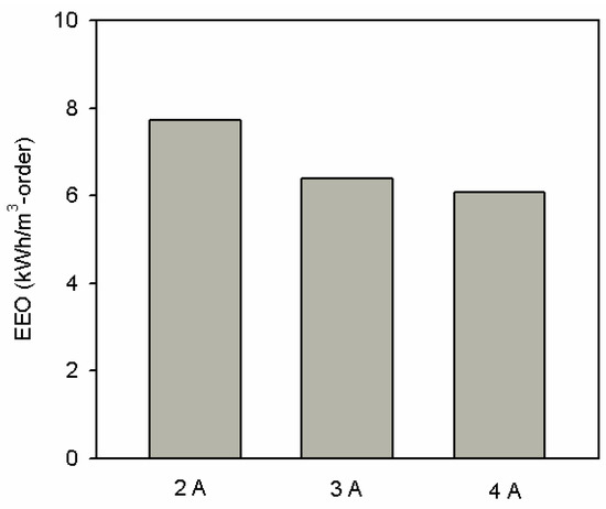The EEO values of the NH4+-N removal during the electrochemistry treatment of the spent caustic wastewater with varying currents were calculated according to Equation (8) and shown in Figure 4. In general, the EEO of the NH4+-N removal decreased from 7.7 to 6.1 kWh/m3-order with increasing currents from 2 to 4 A. The result was attributed to the rapid increase in the NH4+-N removal rate with increasing currents. For example, the k of the NH4+-N removal was enhanced ~3.3 times while the applied current only increased 2 times (i.e., from 2 to 4 A, see Figure 1b). Above all, the NH4+-N removal during the electrochemistry treatment of the spent caustic wastewater at 4 A is a cost-efficient choice.
