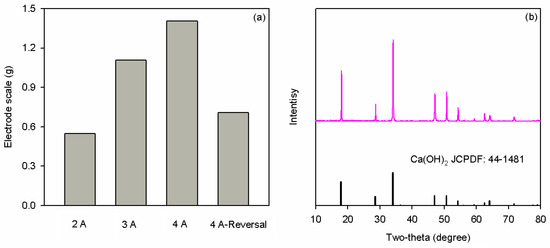 As the electrode scale has a negative influence on electrode life and efficiency [40], the mass of the electrode scale needs to be considered due to the high calcium ion (Ca2+), as shown in Table 1. The amount of the electrode scale was determined by the mass difference values of all the electrodes before and after treatment of 240 s. Figure 5a shows that the electrode scale increased with increasing applied currents. When the applied currents increased from 2 to 4 A, the electrode scale increased from 0.55 to 1.40 g. The phenomenon was caused by the rapid mass transfer at a high current density. At a high current density, more Ca2+ would be transferred onto the surface of the graphene cathodes and more H2O would decompose into the OH−. Thus, the solubility product of the Ca(OH)2 would be reached quickly, and then precipitation would occur. By X-ray diffraction (XRD) analysis, and in comparison with the card of the powder diffraction file (PDF) (PDF#44-1481) [41], the composition of the electrode scale is portlandite Ca(OH)2 (Figure 5b).