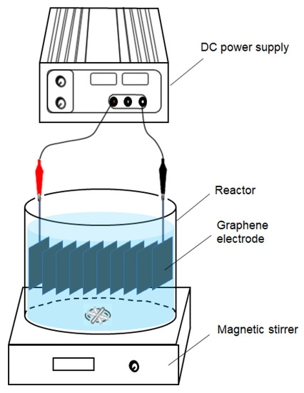 The spent caustic wastewater (1 L) was added in a cylindrical glass reactor, then treated by the electrochemical process for 120 s (see Figure 6 for the experimental setup). For electrochemical experiments, ten electrodes were installed vertically and parallelly into the wastewater, with a gap of 3 mm between the two adjacent electrodes. The two outermost electrodes connect the positive and negative electrodes of a direct current (DC) power supply. The electrodes were graphene plates (6 × 6 cm). The electrochemical experiments were conducted under galvanostatic conditions with varying currents of 2–4 A (corresponding to current densities of 55.6–111 mA/cm2 according to Equation (9)). Electrochemical conditions during the spent caustic wastewater treatment were listed in Table 2.