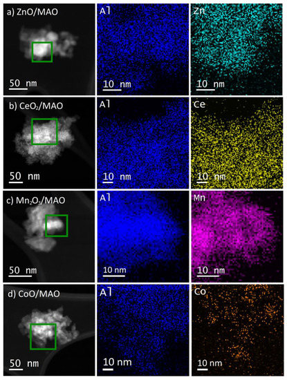 High angle annular dark field STEM images and EDS maps taken from the regions in green boxes for the ALD-modified supports (a) ZnO/MAO, (b) CeO2/MAO, (c) Mn2O3/MAO, (d) CoO/MAO.