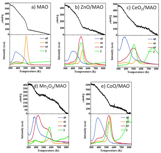 Temperature programmed desorption (TPD) and thermogravimetric analysis (TGA) results for 2-propanol on the supports used in this study, (a) MAO, (b) ZnO/MAO, (c) CeO2/MAO, (d) Mn2O3/MAO, (e) CoO/MAO. Characteristic mass fragments: 2-propanol (m/e = 45), propene (m/e = 41), and acetone (m/e = 43).