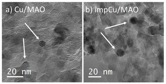 TEM images of (a) Cu/MAO and (b) impCu/MAO. Cu particles are shown by the arrows.