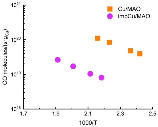 Differential WGS rates on Cu/MAO and impCu/MAO catalysts after reduction at 623 K.
