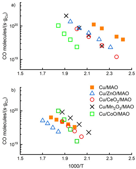 Figure 5a reports Arrhenius plots of the WGS rates on these two Cu/MAO catalysts. The activation energies determined from the slopes of the two lines on this plot are similar, 33.4 kJ/mol and 36.7 kJ/mol; however, the absolute rates differed by a factor of approximately 10. This difference in rates was five times greater than the difference in Cu surface areas, implying that the reaction must be structure sensitive. Literature reports concerning the structure sensitivity of WGS over Cu show disagreements [4]. At least one report concluded that the reaction is strictly proportional to the exposed area of Cu [39], while another report found that the turnover frequency did change with Cu loading, possibly due to micro-strain or the presence of Zn cations [40]. WGS rates on the MAO itself were undetectable between 423 K and 623 K.