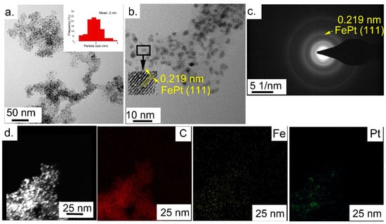 Upon TEM analysis of FePt/VC, particles with an average size of 2 ± 0.3 nm uniformly dispersed on VC were observed (Figure 1a). These particles had a d spacing of 0.219 nm and this would correspond to FePt (111) (Figure 1b,c). The average inter-particle distance between FePt particles was 2.1 ± 0.5 nm (Figure S1). This is expected to result in better electrocatalytic activity because the resulting overlapping of the double layer around the individual particles is expected to further alter the adsorption energy of oxygen containing species (O•, OH•) and increase the ORR [37,38]. Further, STEM and elemental mapping of FePt/VC revealed uniformly distributed Pt and Fe, and this would suggest that these elements are co-located on the VC support.