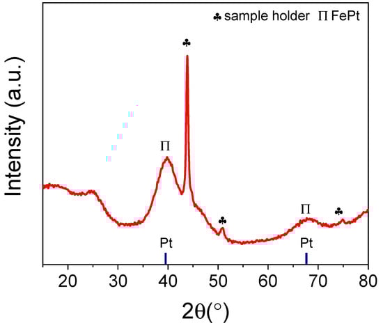 The XRD pattern of as-synthesised FePt/VC revealed diffraction peaks at 40.2 and 68.0° assigned to fct FePt (111) and FePt (220) (Figure 2) [29,39]. The peak positions are shifted slightly towards higher diffraction angles compared to Pt/VC (Figure S3). This shift towards higher diffraction angles could be due to a decrease in the lattice spacing as a result of alloying Pt with the smaller Fe atom [40].