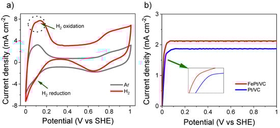 Under saturated H2, the HUPD was more prominent particularly in the region 0.02–0.32 V and the entire CV profile exhibited larger currents associated with the occurring HOR. This signifies that FePt/VC is a good HOR catalyst in comparison to Pt/VC (Figure S4a). The improved HOR performance of FePt/VC is assumed to be due to a weakened binding energy of adsorbed hydrogen (H• −0.38 eV) at the surface of FePt/VC as compared to Pt (−1.05 eV) [42,43]. As such alloying Pt with Fe enhances the HOR. Better performance of FePt/VC for HOR was further confirmed by LSV measurement, where the hydrogen oxidation at FePt/VC started at a lower potential (17 mV vs. SHE) compared to Pt/VC (Figure 3b).