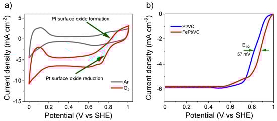 ORR activity of FePt/VC, including (a) its CV at scan rate 50 mV s−1 @ 1600 rpm in 0.1 M aqueous HClO4 under saturated Ar and O2, and (b) the LSV comparison between FePt/VC and Pt/VC at the scan rate of 10 mV s−1 @ 1600 rpm under saturated O2. Catalyst loading was 50 µg cm−2.