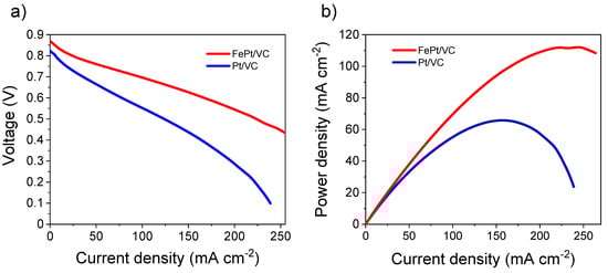 Owing to its excellent electrocatalytic activity for both HOR and ORR, FePt/VC was further evaluated under self-breathing PEMFC operation (Figure 5). For comparison, two MEAs were prepared, one with FePt/VC on both sides of the MEA and the other with Pt/VC at both the anode and cathode of the fuel cell. As expected, the performance of FePt/VC was superior (112 mW cm−2) to that of Pt/VC (66 mW cm−2). This is in line with the observations from RDE where both HOR and ORR activities of FePt/VC were superior to that of Pt/VC.