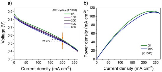 (a) Fuel cell polarisation curves at various cycles of operation under AST, (b) comparison of power density between first cycle (0K) and final cycle (60 K). Performance was monitored in the voltage range of 0.5–0.6 V at the current density of 200 mA cm−2.