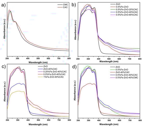 The optical behavior of the synthesized materials was investigated by UV–visible diffuse reflectance (UV–vis) spectroscopy, and the results are shown in Figure 1. A slight red shift in the range above 300 nm of absorption is observed for CAC compared with pristine CMC (Figure 1a). The CAC content in the 0.5%Fe-ZnO-y%CAC composite slightly increased the adsorption intensity in the range above 400 nm compared with 0.5%Fe-ZnO. The energy bandgaps of all the samples were calculated from the plot drawn between the absorption energy hν (eV) and (αhν)0.5 using Tauc’s method [30]. The estimated band gap values of ZnO and ZnO modified by Fe and CAC or CMC are presented in Table 1, and Tauc plots of selected samples are shown in Figure S1 in the Supplementary Materials. Comparing the series of new synthesized x%Fe-ZnO-y%CAC composites, the sample 0.5%Fe-ZnO-40%CAC is characterized by the highest absorption intensity of light in the range above 400 nm, which indicates that the introduction of CAC and modification by Fe resulted in an enhanced light utilization efficiency. That was further evidenced by the photocatalytic degradation of IBU using x%Fe-ZnO-y%CAC composites.