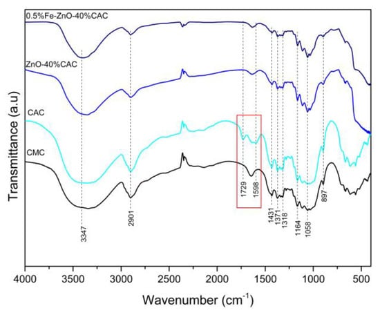 FTIR spectra of CMC, CAC, ZnO-40%CAC and 0.5%Fe-ZnO-40%CAC.