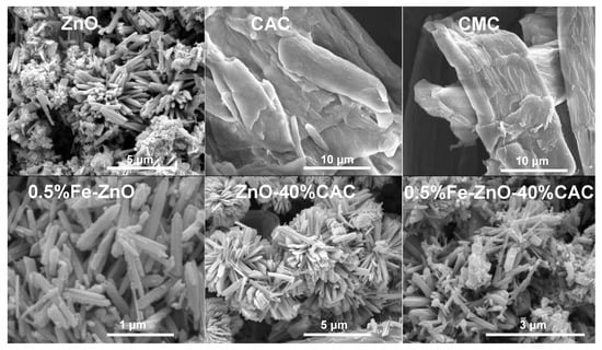 The results of morphological analysis of ZnO, CAC, CMC and ZnO modified by Fe and/or CAC are shown in Figure 3. Firstly, the modification of cellulose by citric acid did not cause significant changes in the morphology of this material. ZnO prepared by the hydrothermal method were rod-like particles, characterized by the non-uniform size, with two groups of dimensions, with smaller length of particles in the range from 200 to 500 nm and with the larger length in the range from 2 to 5 μm. During the hydrothermal synthesis in the presence of iron ions, rod-like particles of ZnO were also produced, with one group of dimensions in the range from 300 nm to 1 μm. Also, in this sample small particles were observed on ZnO with a diameter up to 50 nm. The synthesis of the composite ZnO-CAC resulted in the order of ZnO rod-like particles onto the shape of the flowers. Rod-like particles were characterized by different widths, with the narrow bars with a width of about 50 nm and wider rods becoming plates with the width up to 500 nm. The length of the narrow and wide particles was similar and equal from 1 to 3 μm. The most diverse structure was observed for the sample 0.5%Fe-ZnO-40%CAC, which consisted of rods with length from 500 nm up to 1.2 μm and smaller particles with the diameter of about 10 nm. It is also worth mentioning that the ZnO particles were directly coated onto the cellulose surface and therefore cellulose was not visible on the SEM images.