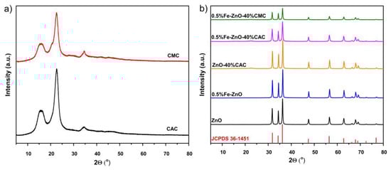 XRD patterns of the (a) purchased microcrystalline cellulose (CMC) and their citric acid modification (CAC); (b) ZnO-based composites with 0.5% Fe and/or 40% cellulose.