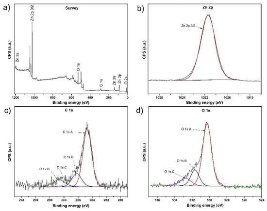 X-ray photoelectron spectroscopy (XPS) is an effective analytical method for studying elemental composition, types of functional groups and chemical bonds present on the surface of solids. The XPS analysis of 0.5%Fe-ZnO-40%CMC sample was performed and the results are presented in Figure 5. Based on the XPS spectra presented in Figure 5a, it was shown that the analyzed sample consisted of Zn, C and O atoms in 21.6, 28.8 and 49.6%, respectively. Signals for Fe were not registered during XPS analysis, which indicates that Fe was below the detection limit or introduced into the structure of ZnO. In Figure 5b, a peak at a binding energy of 1021.7 eV corresponds to Zn2+ of ZnO [36]. In Figure 5c, the XPS spectrum of the C 1s region presents an asymmetric peak. This indicated the presence of carbon in different oxidation states. The curve was fitted to four distinct carbon components: (i) C 1s A at 284.7 eV is attributed to C-C bonds in 67.83 at. %; (ii) C 1s B at 286.2 eV is a signal for C-O bonds and at. % concentration equals 17.43%; (iii) C 1s C at 287.6 eV is for C=O bonds and the concentration is 3.4 at. %; (iv) C 1s D at a binding energy of 288.7 eV corresponds to carbon in O=C-O bonds; at. % of this signal is 11.34% [37]. Also, an asymmetric peak for O 1s was registered (see Figure 5d) and three different signals were distinguished at: 530.28 eV, 531.68 eV and 532.77 eV, which can be assigned to oxygen in Zn-O, C=O and C-O bonds, respectively [36,37].