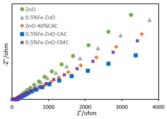 The electrochemical impedance spectroscopy (EIS) was performed in an aqueous electrolyte solution of 1 M Na2SO4 at ambient temperature (25 °C). Results of this analysis for ZnO, 0.5%Fe-ZnO, ZnO-40%CAC, 0.5%Fe-ZnO-40%CAC and 0.5%Fe-ZnO-40%CMC are presented in Figure 6. The arcs on the spectrogram of EIS electrochemical impedance indicate the resistance of the charge transfer layer at the interface between the electrode and electrolyte. Higher efficiency of charge transfer is revealed by a smaller arc, which indicates a lower resistance [38]. In our study, the smallest arc radius was observed for the 0.5%Fe-ZnO-40%CAC composite, which implies that the charge transfer layer resistance of this material was smaller than for other measured photocatalysts: ZnO, 0.5%Fe-ZnO and ZnO-40%CAC. It was observed that the presence of CAC caused a higher efficiency of charge transfer compared to the composite with non-modified microcrystalline cellulose. Additionally, every applied modification of ZnO accelerated the photocatalytic activity due to better separation of the photo-induced electron-hole pairs indicated by exhibiting better transfer efficiency.