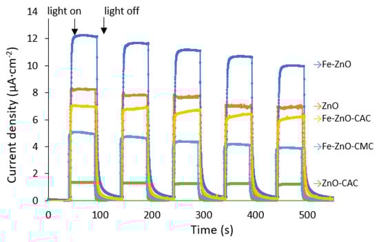Furthermore, the photocurrent responses of ZnO modified with Fe and/or CAC were performed to study the separation and transfer efficiency of photogenerated charge carriers in the photocatalysts. This measurement was performed in five on–off cycles of LED light irradiation in the range from 380 to 390 nm. As shown in Figure 7, when the light is turned on, immediate photocurrent responses can be observed. The 0.5%Fe-ZnO photocatalyst exhibited the highest photocurrent density in comparison with other materials, which indicated the reduced interface resistance and the improved separation and migration efficiency of the photogenerated e/h+ pairs. After several successive switch on–off cycles, the photocurrent results of ZnO and 0.5%Fe-ZnO decreased by about 16% and 18%, respectively. The modification of 0.5%Fe-ZnO by CAC decreased the photocurrent response but increased the stability of the following switching cycles and was lower in the last cycle only by 4%. Comparing the influence of cellulose modification by citric acid in the composite, the photocurrent was higher at about 50% for the sample 0.5%Fe-ZnO-40%CAC than for the sample 0.5%Fe-ZnO-40%CMC. Considering the trends of green materials, modification by CAC caused a significant increase in photocurrent response and affected positively on the stability of the 0.5%Fe-ZnO-40%CAC composite compared with the hybrid with CMC, so the operation of CMC modification by citric acid is reasonable.
